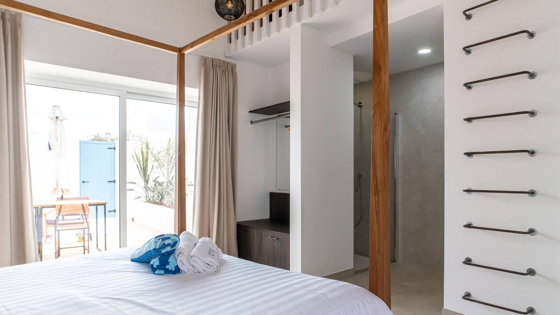 De kamer heeft 2 privé terrassen met ligstoelen, buitenkeuken en eettafel.