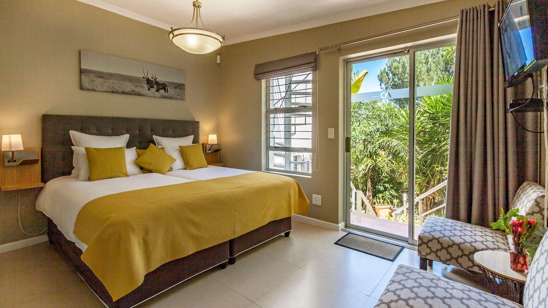 Ingadi Studio is een 25m² grote studio en kijkt uit over de tuin en het zwembad. Ingadi is voorzien van twee 1-persoons bedden gecombineerd tot een Kingsize. Deze studio is volledig self-catering - magnetron, waterkoker, kookplaat, Nespresso koffiemachine en kwaliteitsbestek en porselein Deze studio is in november 2018 volledig gerenoveerd. Deze kamer heeft een en-suite badkamer met hoekbad/douche combinatie. Beide kamers hebben airconditioning, gratis wifi, flatscreen tv, satelliet tv, en een privé terras of patio. Wij hebben regelmatig speciale aanbiedingen, vraag beschikbaarheid en de laatste lage prijzen op per e-mail!