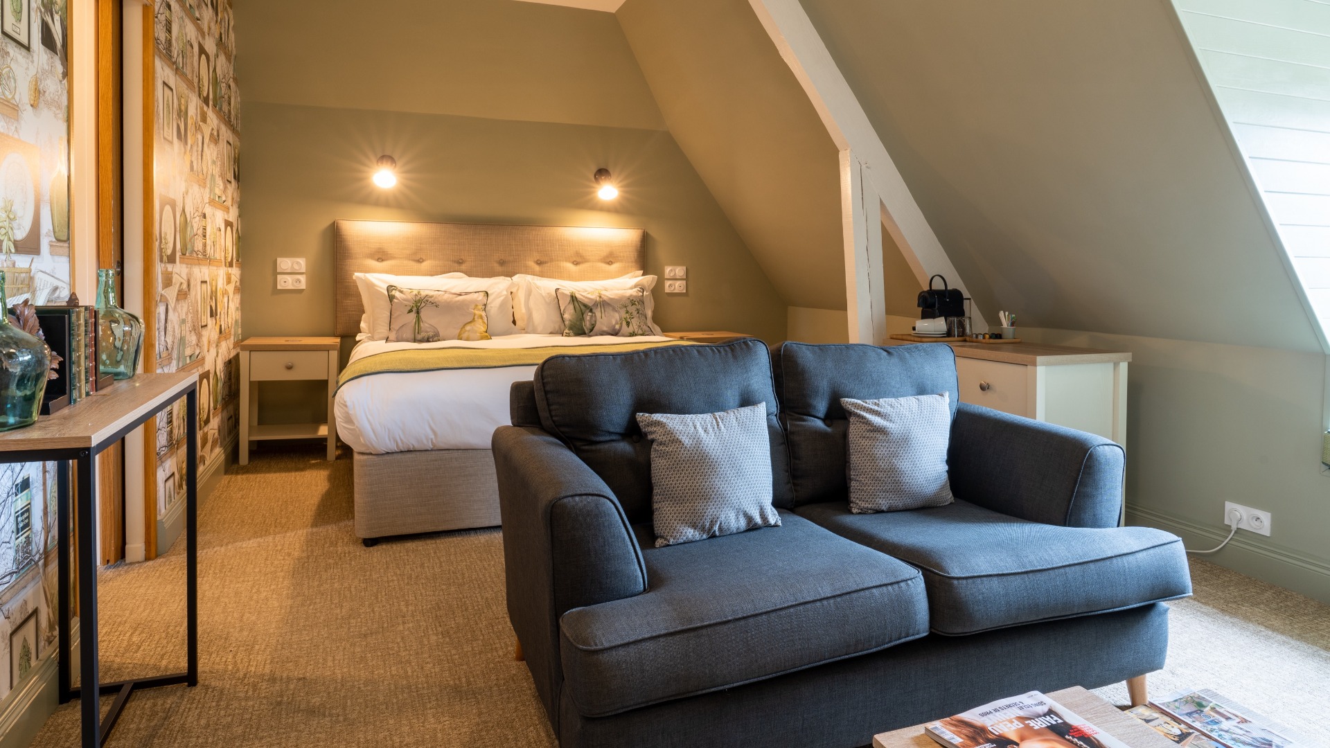Onze Pigeonnier Suite, gelegen op de tweede verdieping, is een lichte en ruime suite, ideaal voor wie comfort en adembenemende uitzichten zoekt. De aparte lounge, gevestigd in de toren, heeft ramen aan twee zijden, waardoor de ruimte wordt overspoeld met natuurlijk licht en een prachtig panoramisch uitzicht biedt op het omliggende landschap.